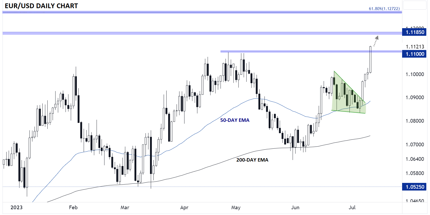 果不其然,美元是当天表现最弱的主要货币对,但欧元/美元的走势尤其引人注目。我们发稿时,世界上交易量最大的货币对正飙升超过100点,突破1.1100,创下16个月来的最高点位
